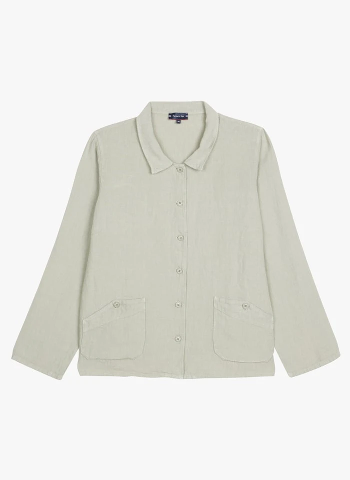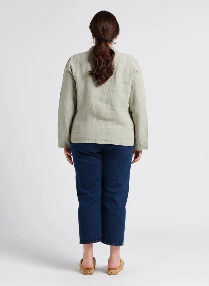 This model is shown wearing Round-neck striped cotton T-shirt by ARMOR LUX, High-rise straight-leg jeans by LEVI’S, Braided wedge mules by JONAK