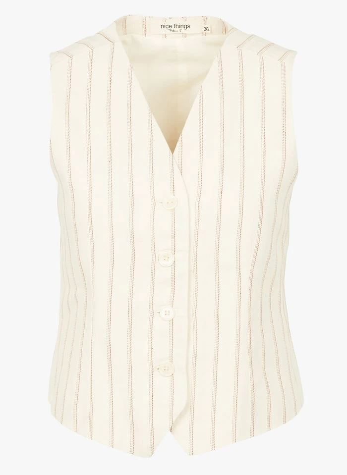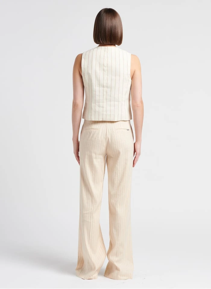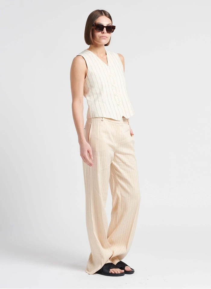 This model is shown wearing Striped wide-leg pants by LA PETITE FRANCAISE, Flat satin mules by ANCIENT GREEK SANDALS