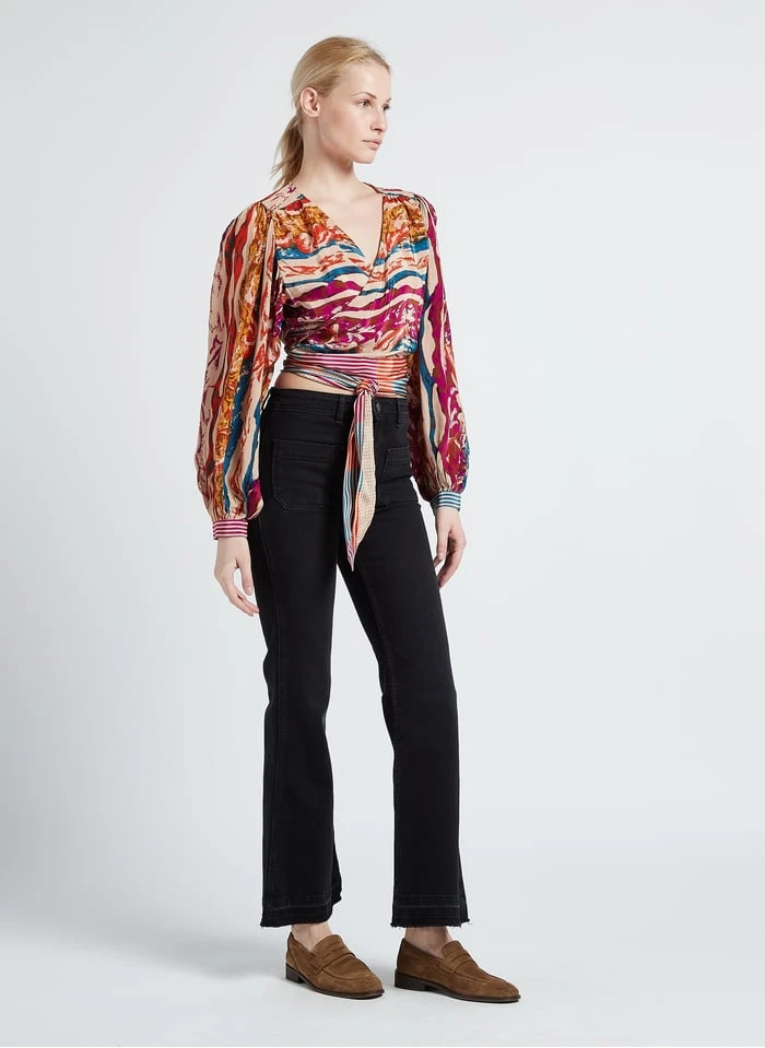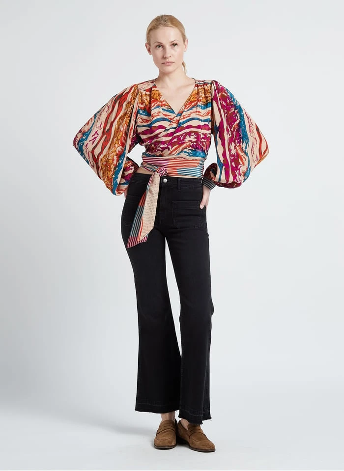 This model is shown wearing Flared faded cotton jeans by SWILDENS