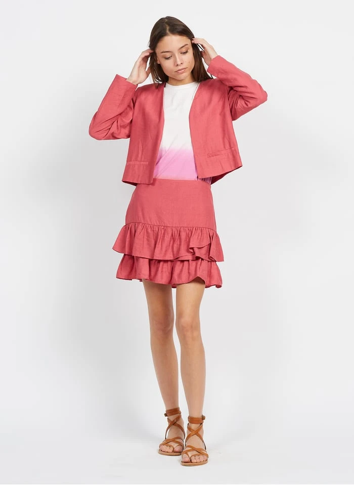This model is shown wearing Short flounced skirt by DES PETITS HAUTS