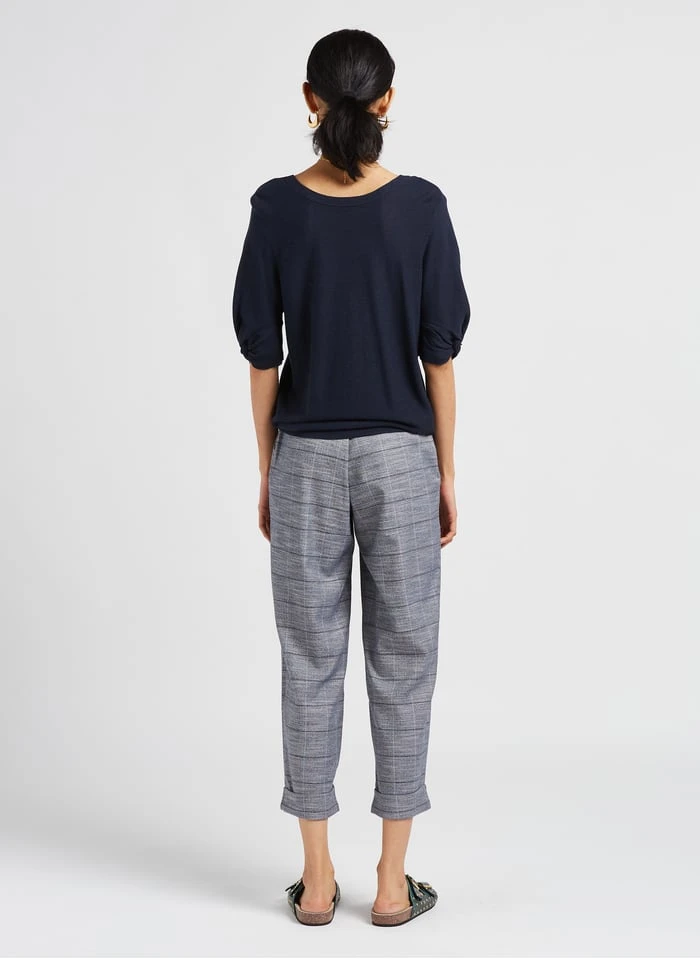 This model is shown wearing Printed carrot pants by IKKS, Flat studded leather sandals by CLARIS VIROT