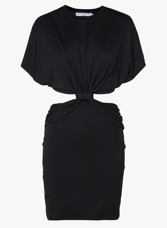 This model is shown wearing Heeled leather sandals with pointed toe by IRO