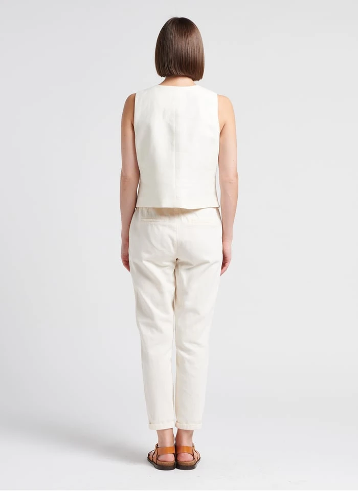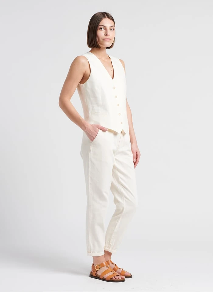 This model is shown wearing 7/8 cotton chinos by MAISON 123, Flat leather sandals by JONAK