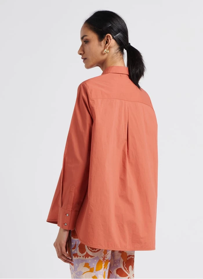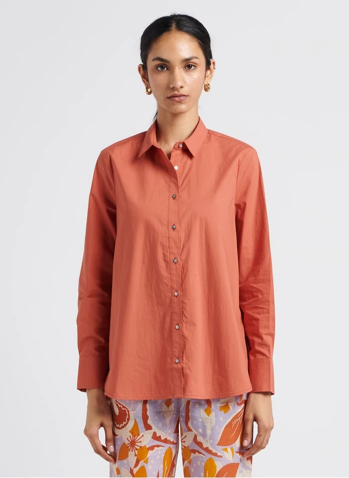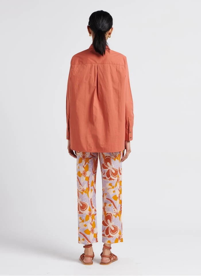This model is shown wearing Straight fluid printed cotton pants by BELLA JONES, Flat leather sandals by K JACQUES