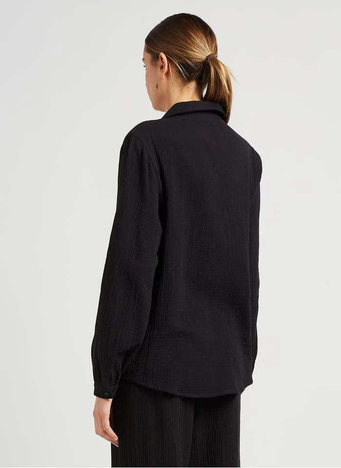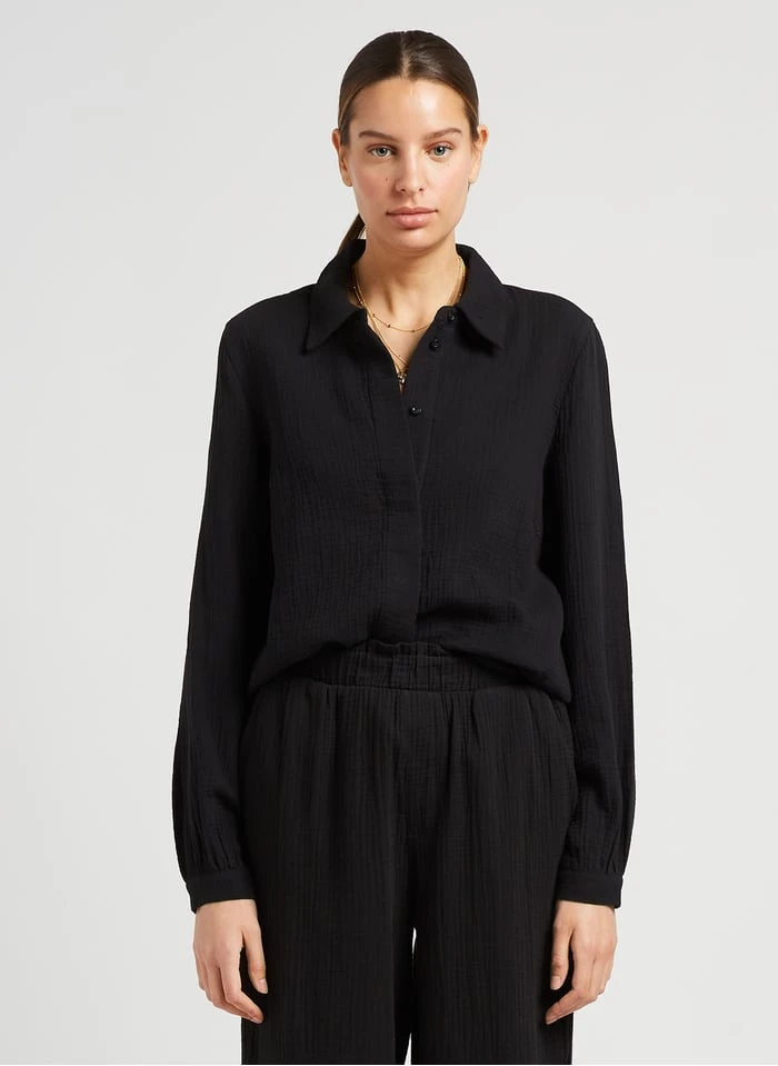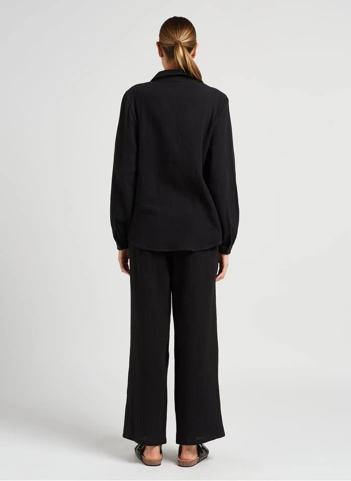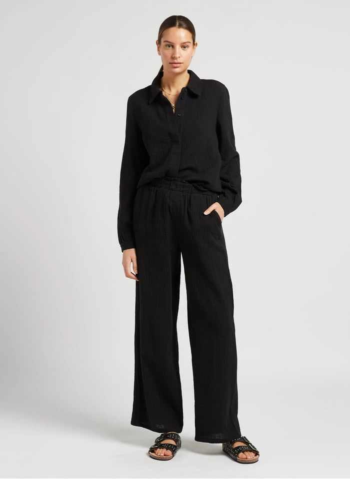 This model is shown wearing High-waisted wide-leg cotton pants by OBJECT