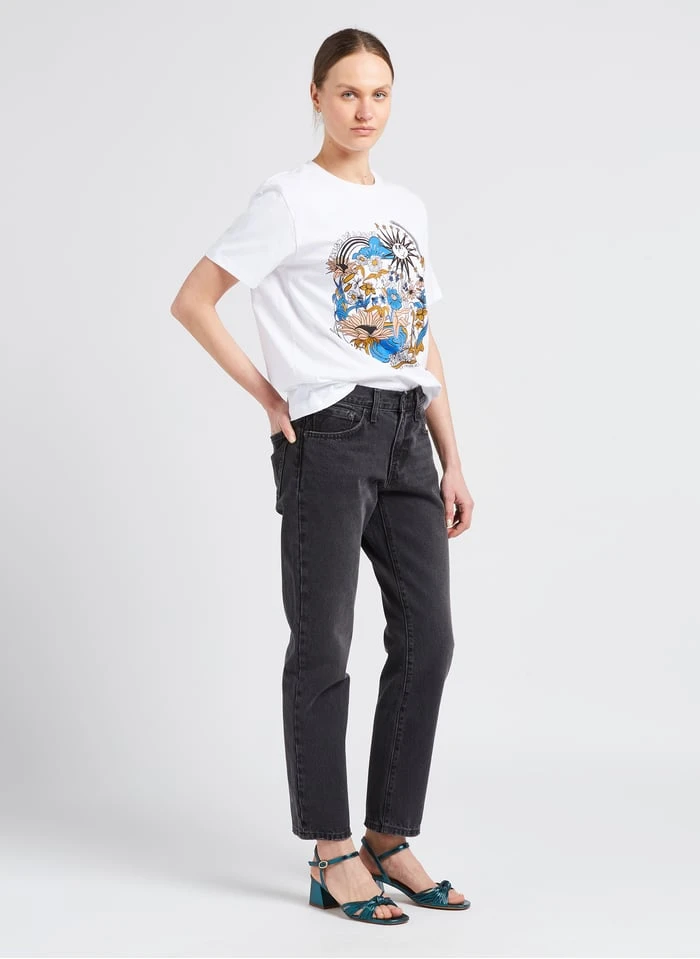This model is shown wearing Regular-waist straight-leg jeans by LEVI’S, Heeled patent leather sandals by RIVECOUR