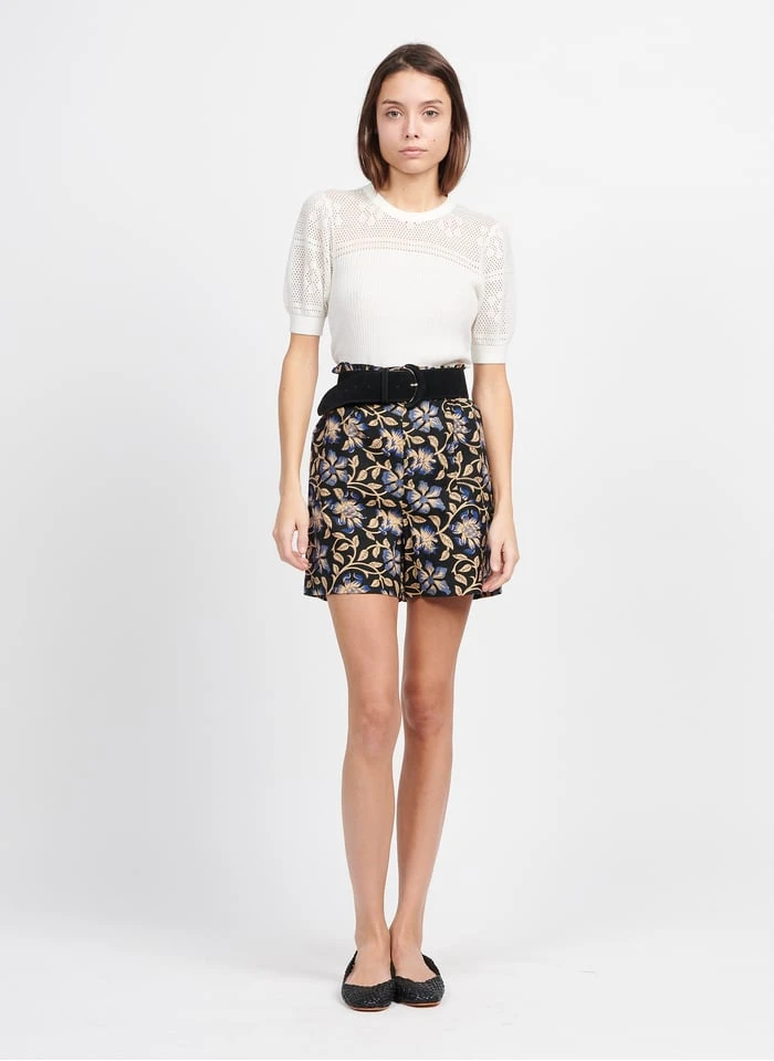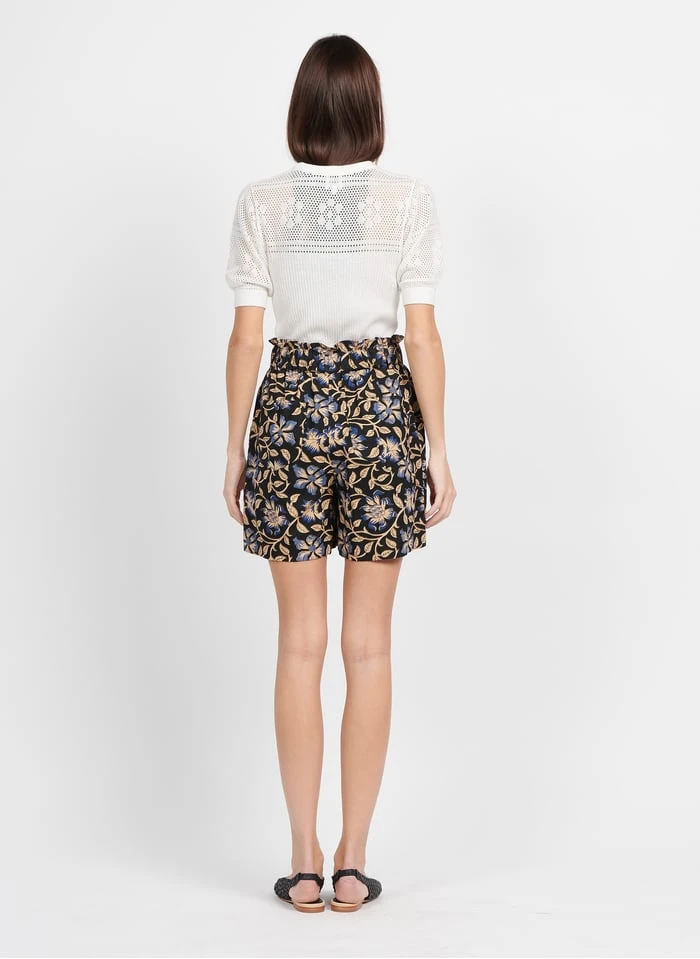 This model is shown wearing Leather belt by PETITE MENDIGOTE, Printed cotton shorts by PETITE MENDIGOTE