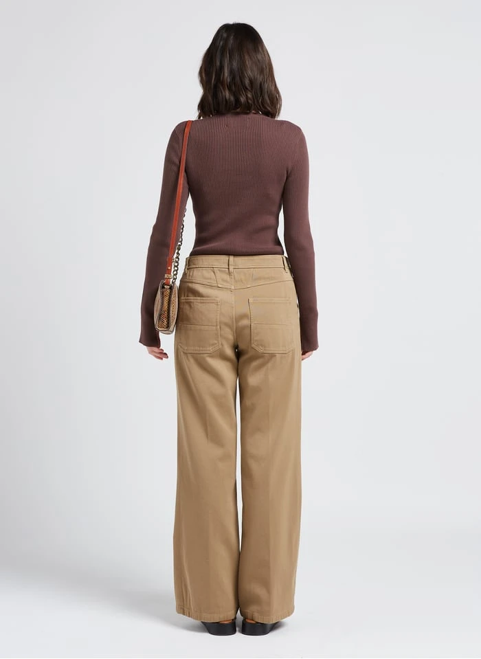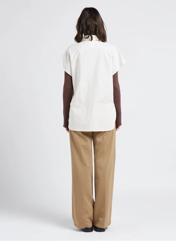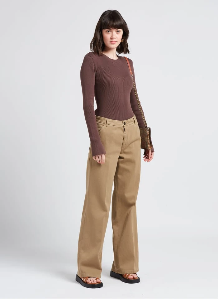 This model is shown wearing Wide-leg organic cotton pants by CLOSED, Flat calfskin leather sandals by ALOHAS