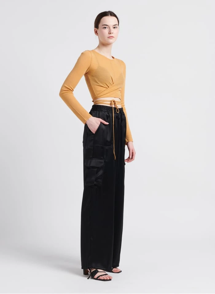 This model is shown wearing Flowing satin-look pants by SAISON 1865, Medium-heel smooth leather sandals by ANAKI