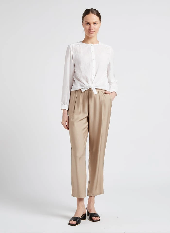 This model is shown wearing Satin carrot pants by SEE U SOON, Leather sandals by MELLOW YELLOW
