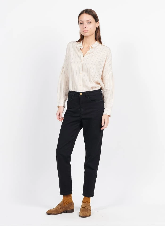 This model is shown wearing Cotton-blend mom jeans by SESSUN