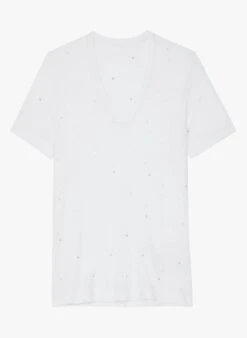 Zadig & Voltaire WASSA – White V-neck Linen-blend T-shirt With Rhinestone Embellishment