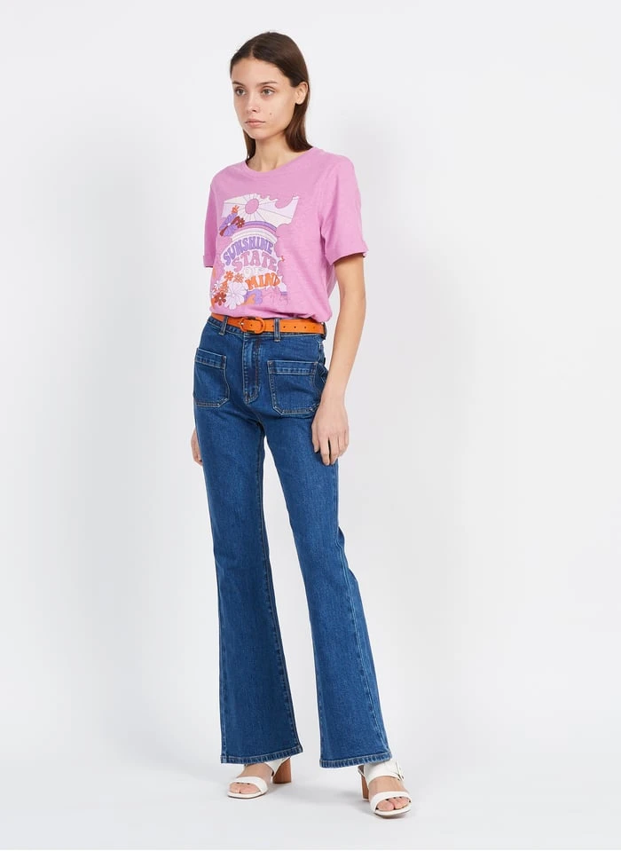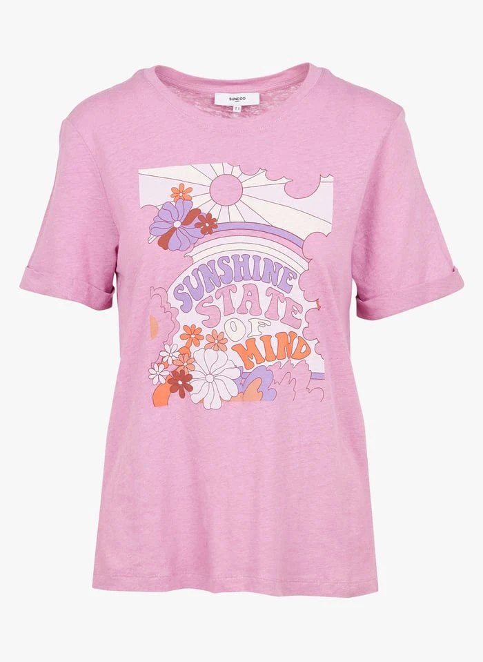 Round-neck linen and cotton T-shirt with screen print by Suncoo for Women.