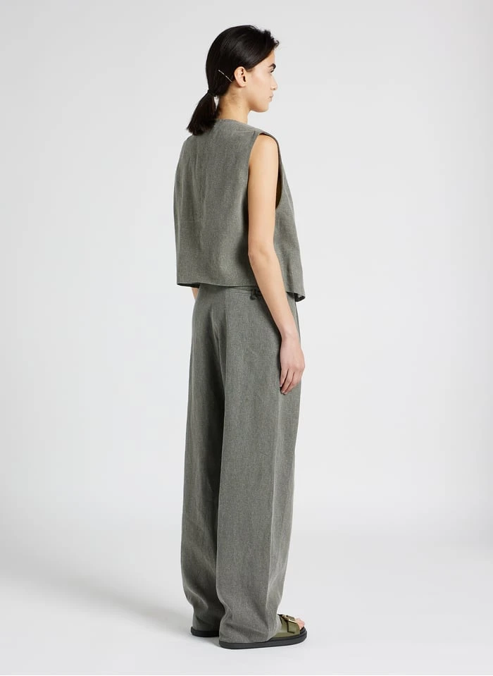 This model is shown wearing High-waisted linen-blend carrot pants by HUMANOID, Square-neck organic cotton vest top by MOSS COPENHAGEN, Flat leather sandals by ALOHAS