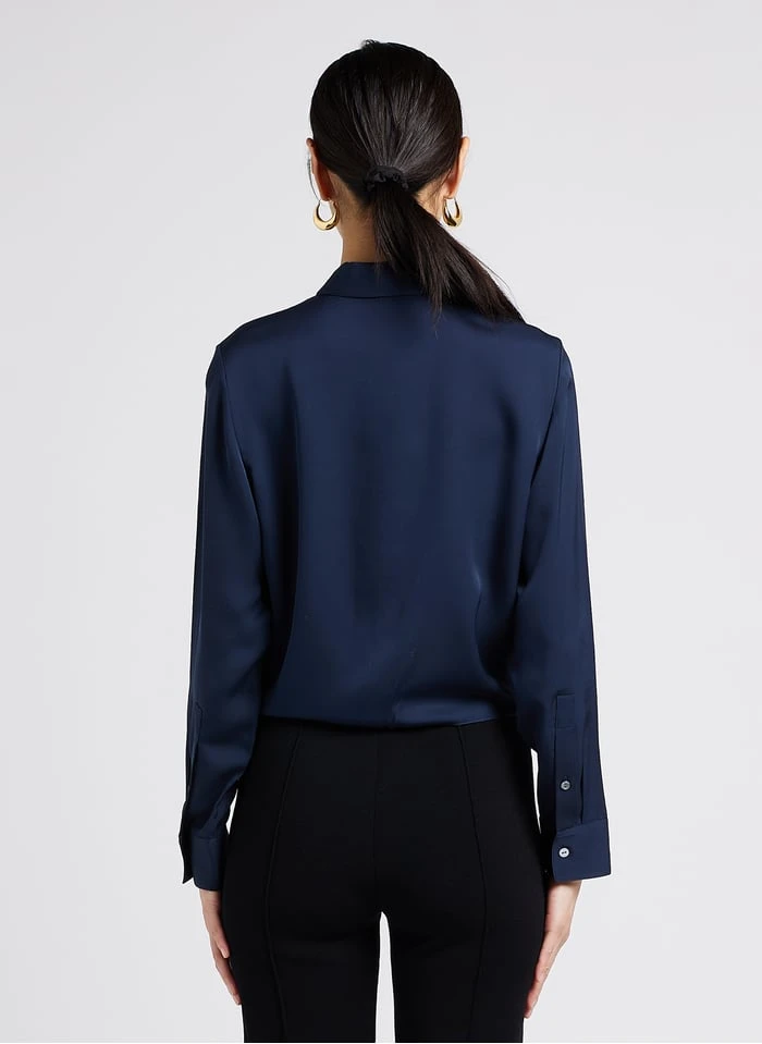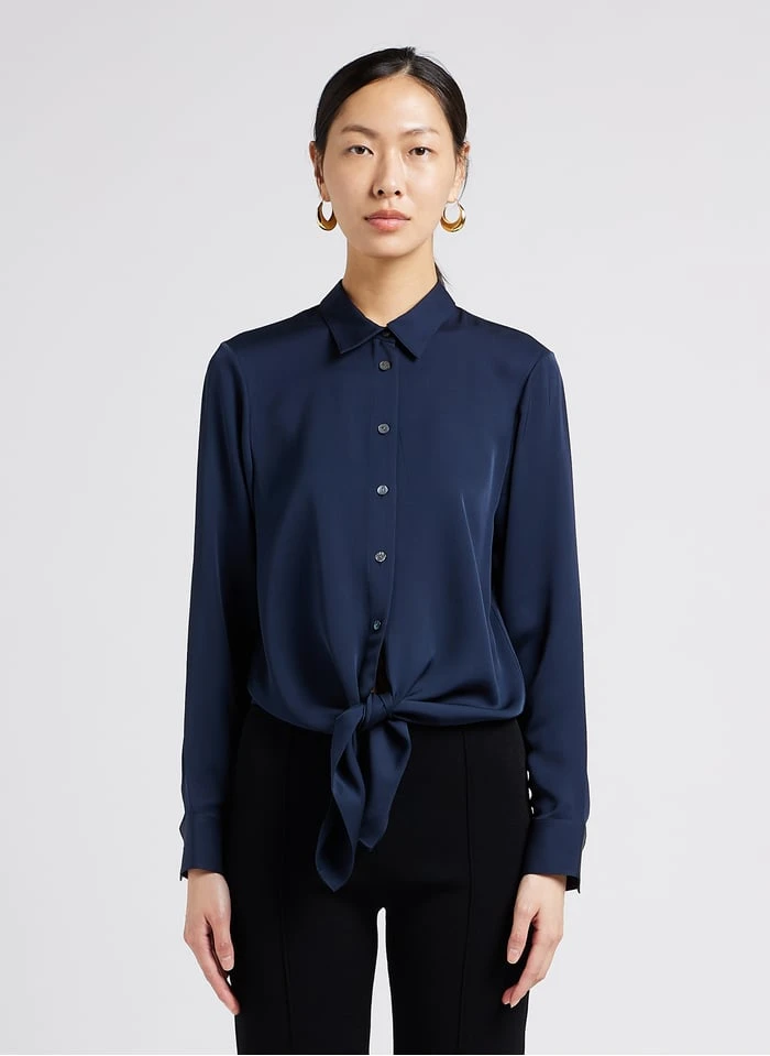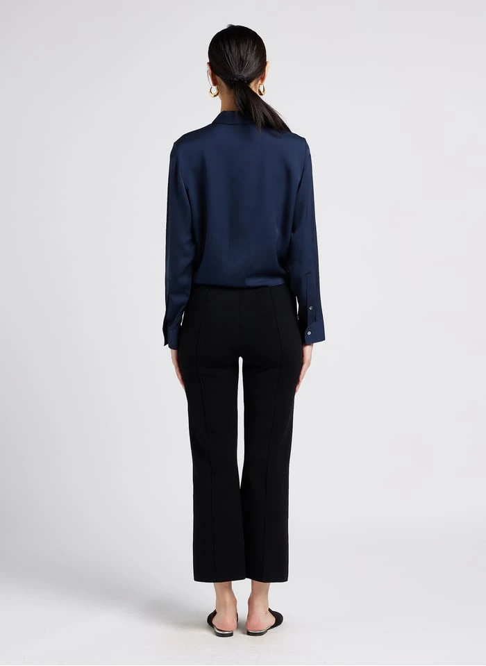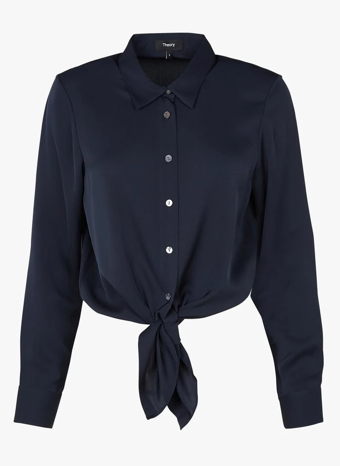 This model is shown wearing Wide-leg stretch fabric pants by THEORY