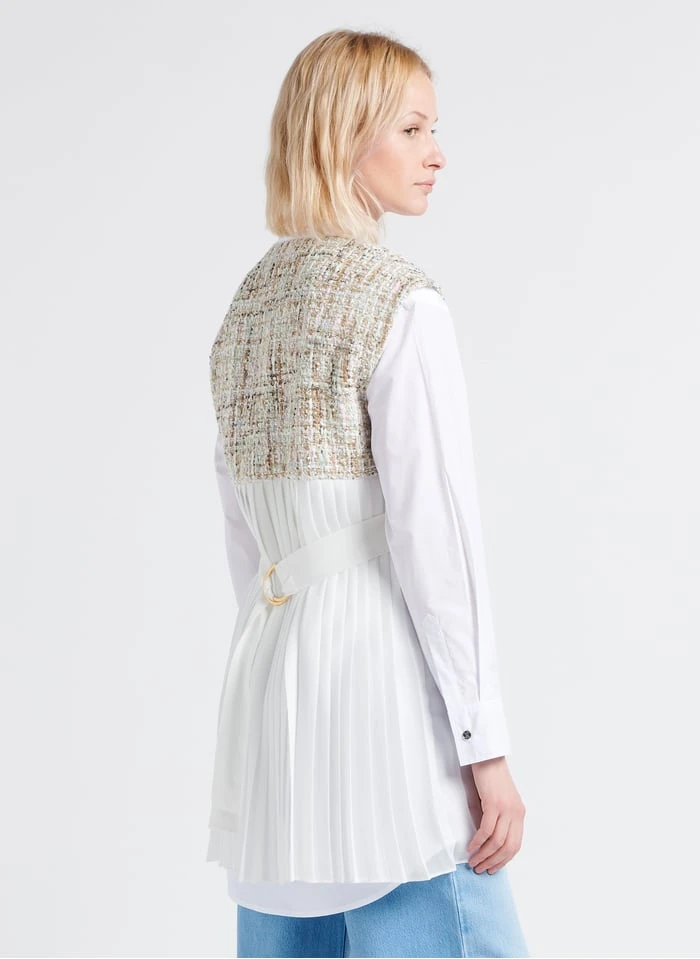 This model is shown wearing Short embroidered cotton dress with classic collar by TWINSET, High-rise wide-leg jeans by MAISON 123