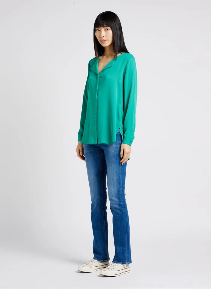 This model is shown wearing Faded cotton bootcut jeans by LE TEMPS DES CERISES