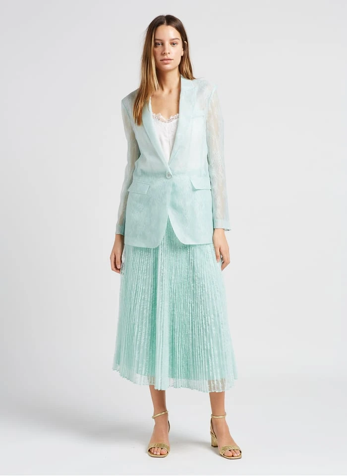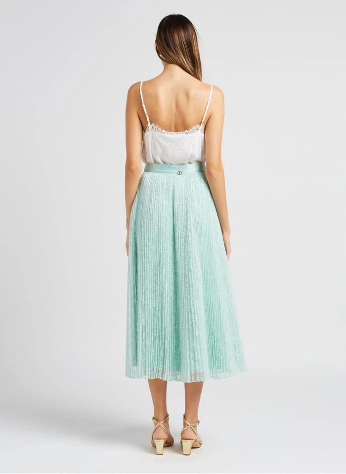 This model is shown wearing Pleated lace midi skirt by TWINSET