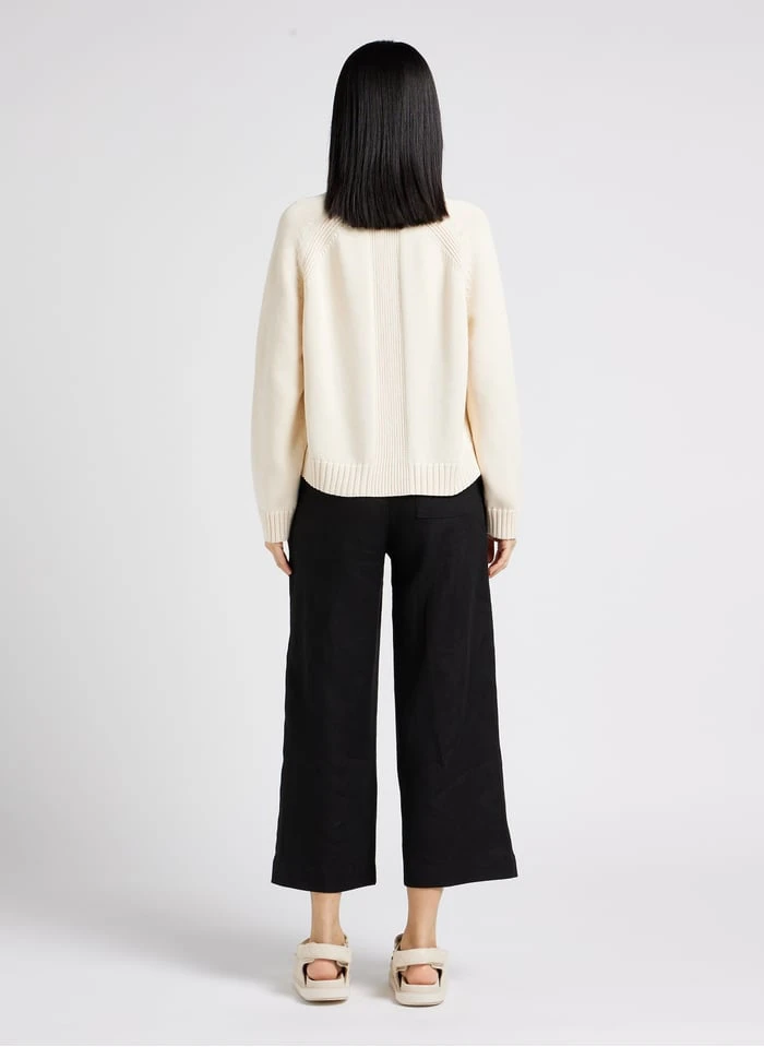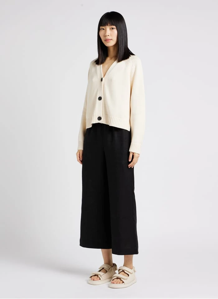 This model is shown wearing 7/8 straight linen pants by WHISTLES, Flat leather sandals by ALOHAS