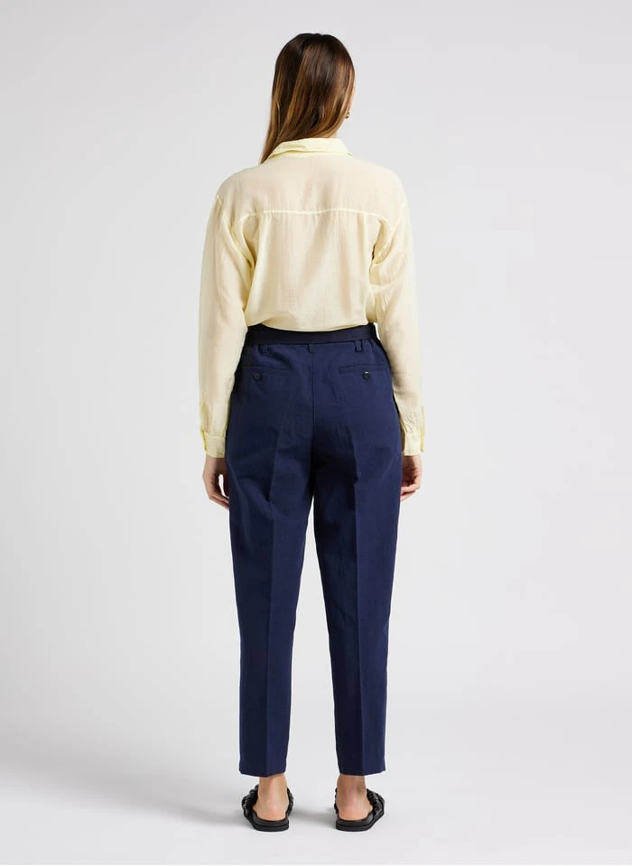 This model is shown wearing High-waisted linen carrot pants by POMANDERE, Flat pleated leather sandals by ANONYMOUS COPENHAGEN
